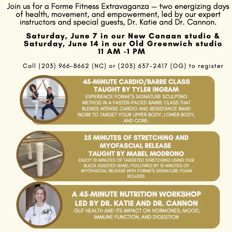 Join us for a Forme Fitness Extravaganza — two energizing days of health, movement, and empowerment, led by our expert instructors and special guests, Dr. Katie and Dr. Cannon.